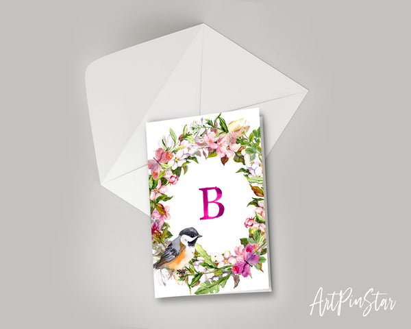 Alphabet Wreath Pink Letter B Boho Floral Bird Monogram Note Cards