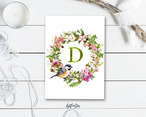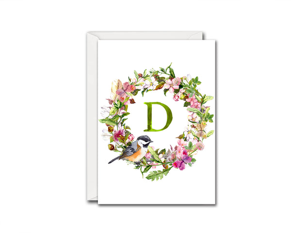 Alphabet Wreath Green Letter D Boho Floral Bird Monogram Note Cards