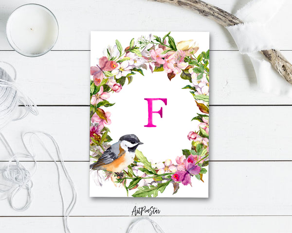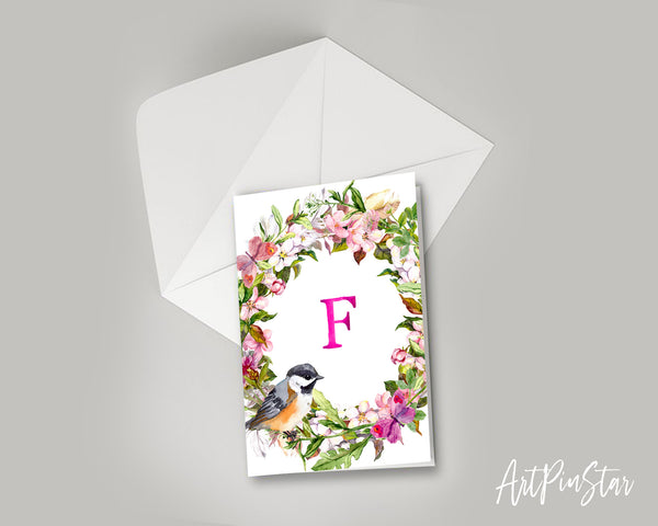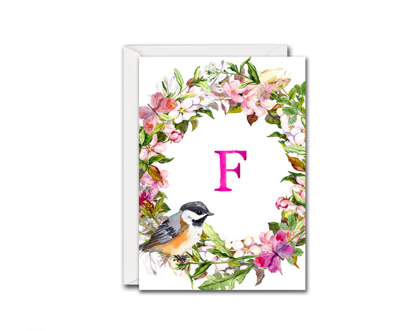 Alphabet Wreath Pink Letter F Boho Floral Bird Monogram Note Cards