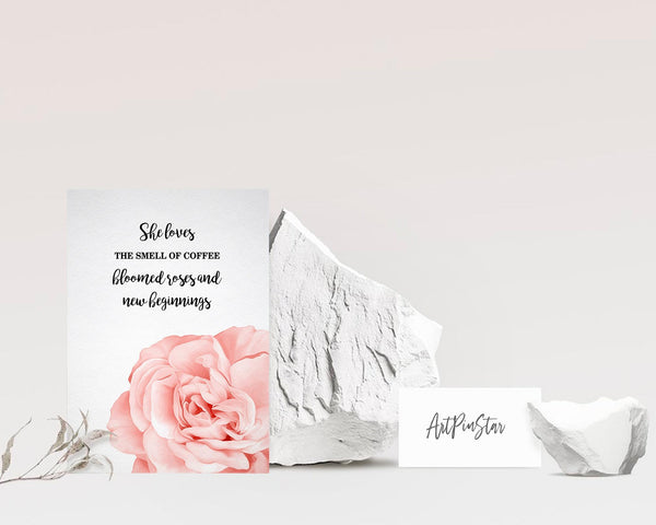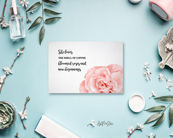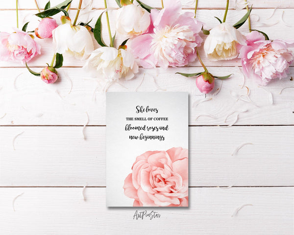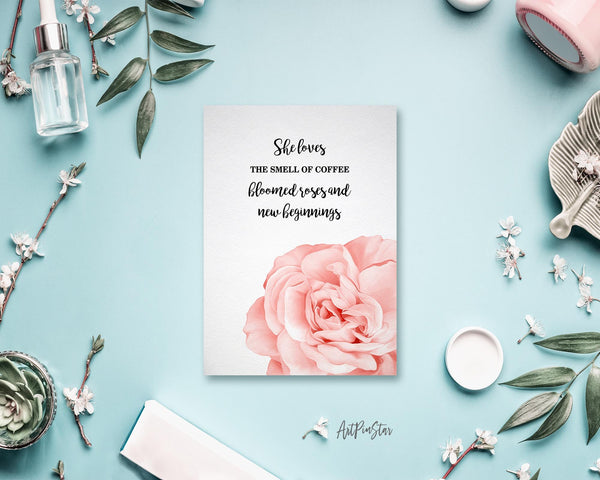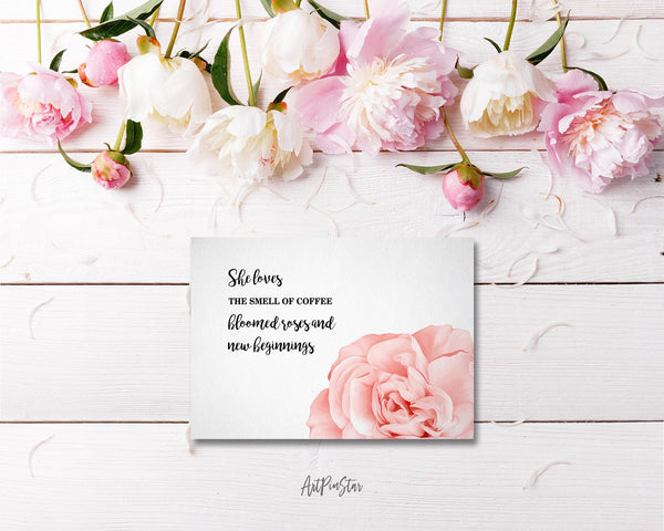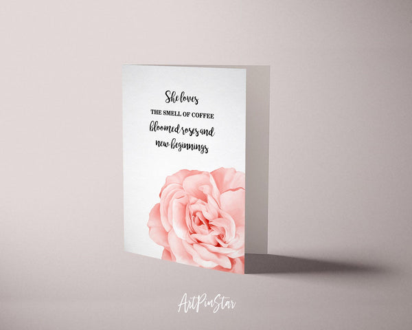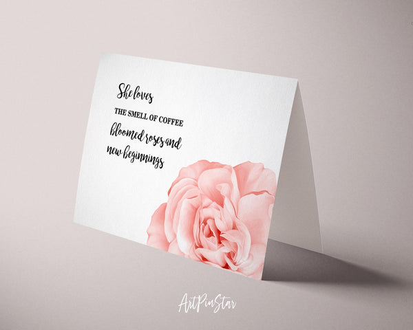 She loves the smell of coffee bloomed roses and new beginnings Flower Quote Customized Gift Cards