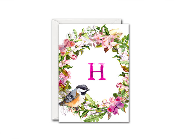 Alphabet Wreath Pink Letter H Boho Floral Bird Monogram Note Cards