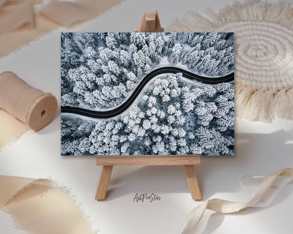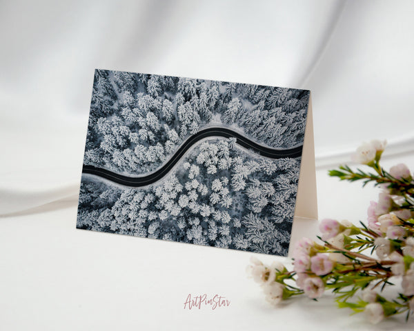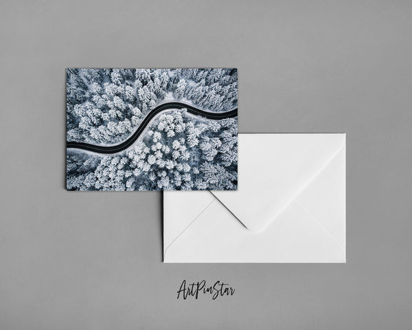 Curvy Windy Road in Snow Covered Forest Landscape Custom Greeting Cards