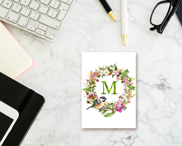 Alphabet Wreath Green Letter M Boho Floral Bird Monogram Note Cards