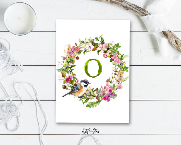 Alphabet Wreath Green Letter O Boho Floral Bird Monogram Note Cards