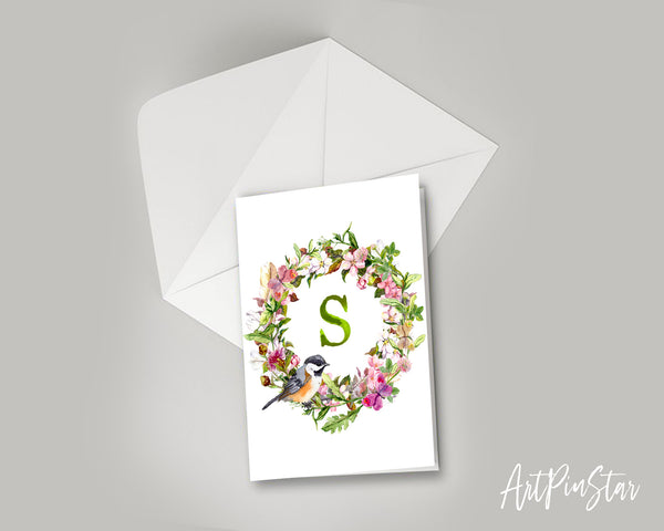 Alphabet Wreath Green Letter S Boho Floral Bird Monogram Note Cards