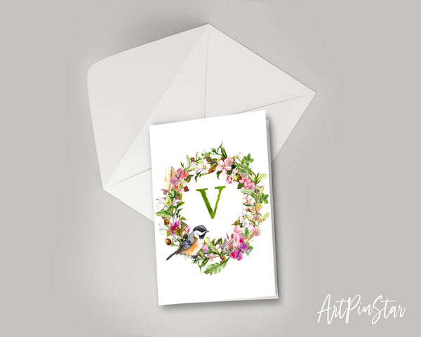 Alphabet Wreath Green Letter V Boho Floral Bird Monogram Note Cards